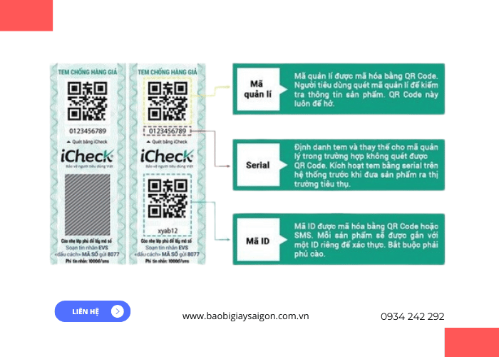 - Mã QR hoặc mã số ẩn: Liên kết với hệ thống xác thực, cho phép người dùng quét mã để kiểm tra thông tin sản phẩm (nguồn gốc, ngày sản xuất, lô hàng).